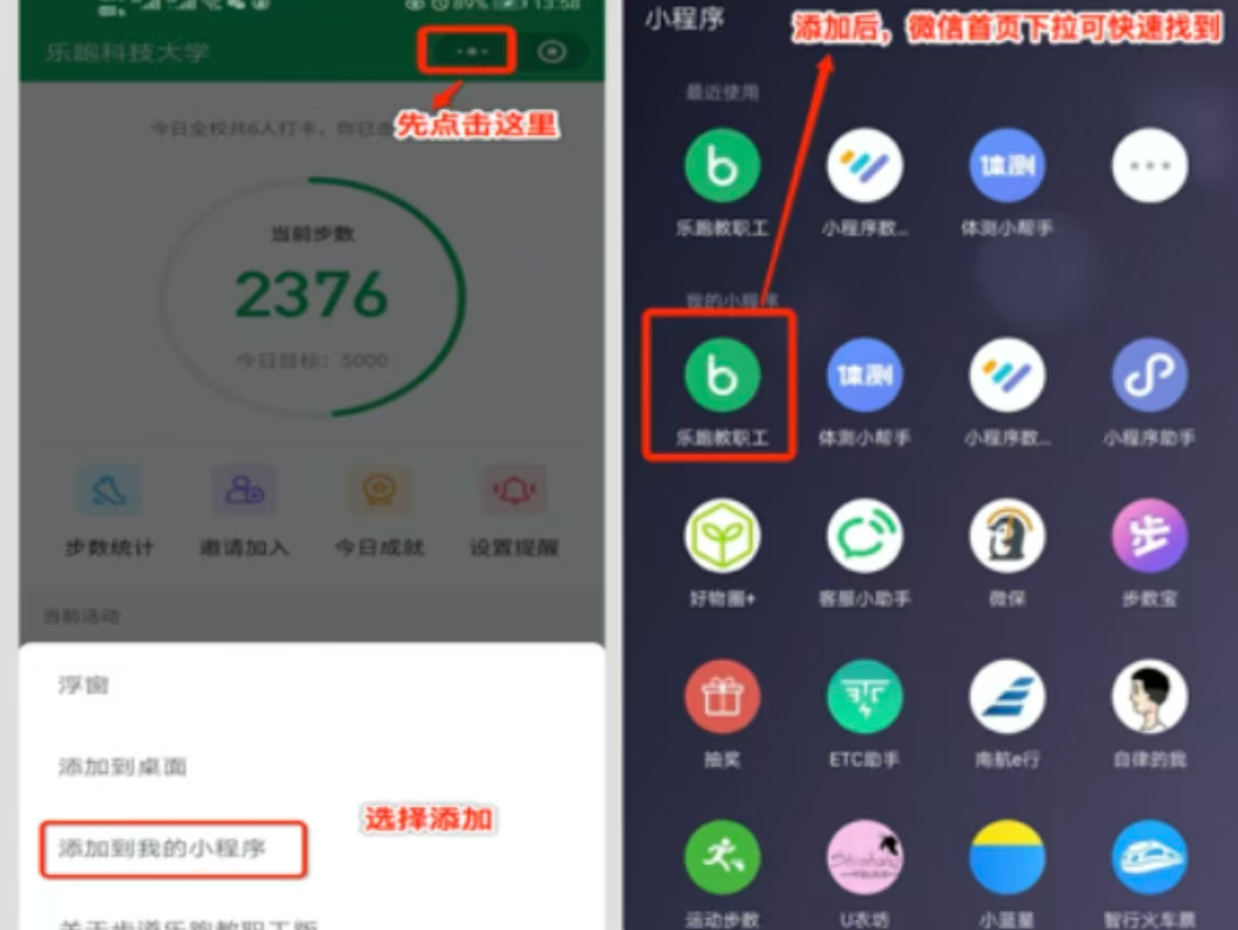 1.搜索“步道乐跑教职工版”小程序后,为方便能在微信首页通过下拉方式快速进入,可以按如下方式把小程序添加到我的小程序。