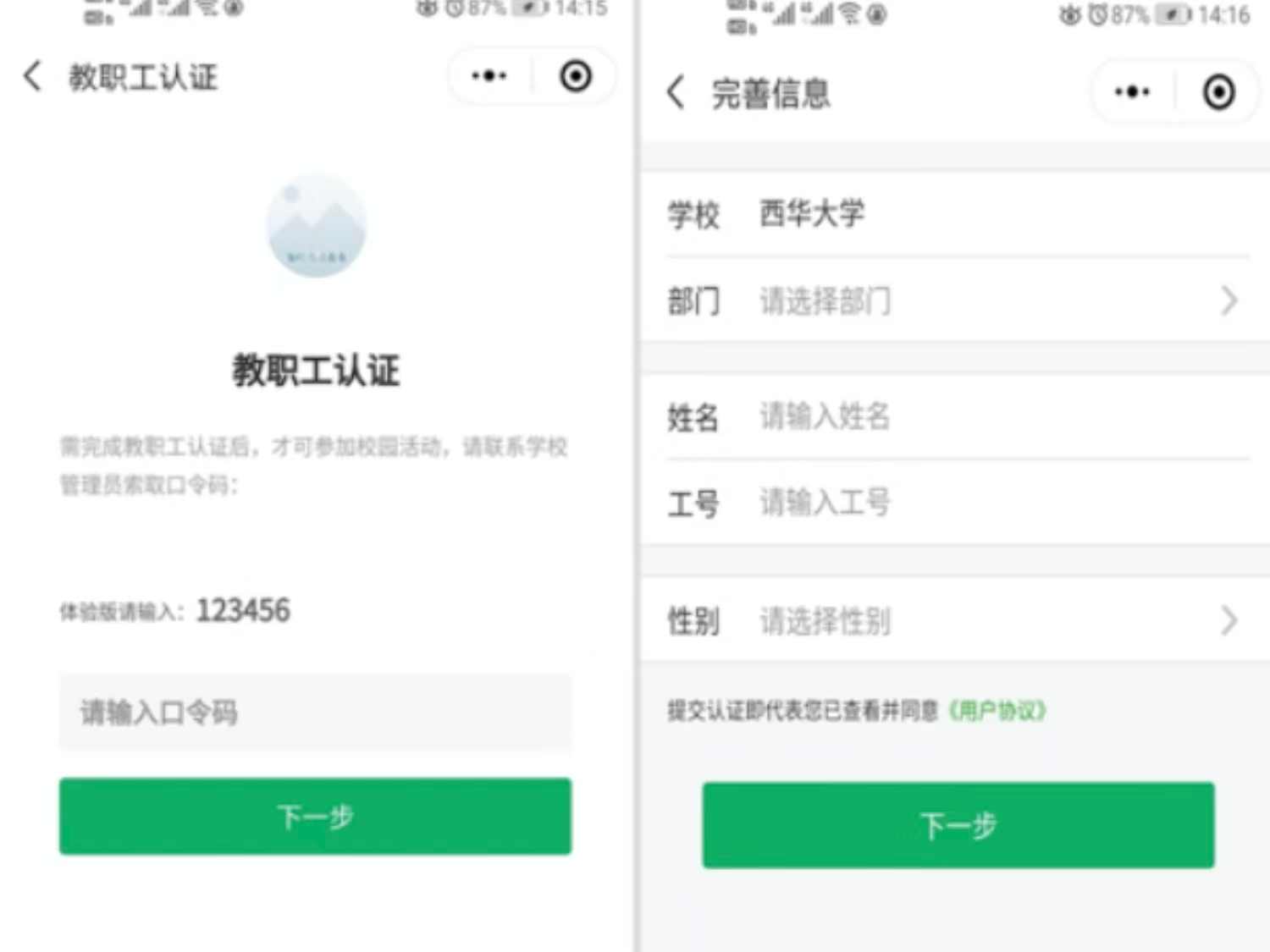 2.第一次进入需要输入学校口令码818019,填写教职工信息进行认证,输入后请确认学校信息准确。(以下为之前某学校案例)
