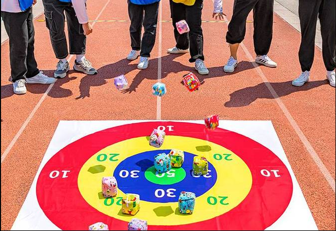 (1)站在投掷线后,向靶盘投掷沙包,每人5次机会。