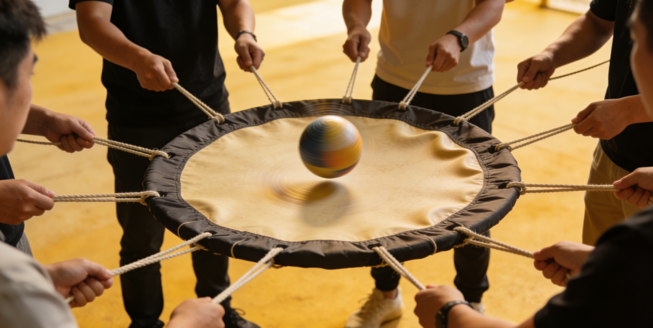 (1)以 4—6 人为一组,手持绳索控制同心鼓,合力颠起弹力球,弹起高度不低于30厘米。