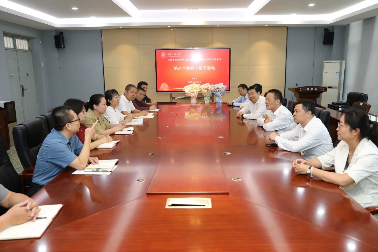 9月10日第41个教师节当天,校党委书记张志昌、校党委副书记殷永建等一行在临潼校区行政楼对国家级一流本科课程获得者、国家自然基金面上项目负责人、国家青年拔尖人才、全国高校教师教学创新大赛二等奖获奖者、陕西省大中专学生志愿者暑期“三下乡”社会实践活动省级先进个人等教师代表进行了集体慰问。随后张志昌带队走访慰问了环境与化学工程学院、城市规划与市政工程学院、网络安全学院、马克思主义学院、理学院、工程训练中心等单位,为一线教师代表和教学团队代表送上鲜花,并致以诚挚问候和美好祝福。